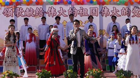2022级音乐学专业陈帅、喻心悦、马凌云、魏星月与本地教师一起演唱歌曲串烧《风禾满田香》,体现了皖疆两地教育工作者同心同德、共育新人的深厚情谊与责任担当。