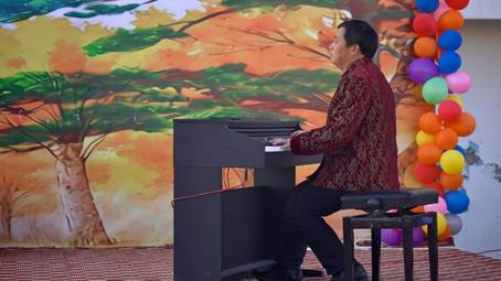 援疆支教指导教师、副院长彭传山先后演奏了手风琴和钢琴作品。手风琴曲《新疆民歌联奏》轻快活泼,熟悉的旋律响起,现场即报以热烈掌声;钢琴独奏《保卫黄河》则以磅礴气势奏响黄河壮歌,将现场爱国热情推向高潮。