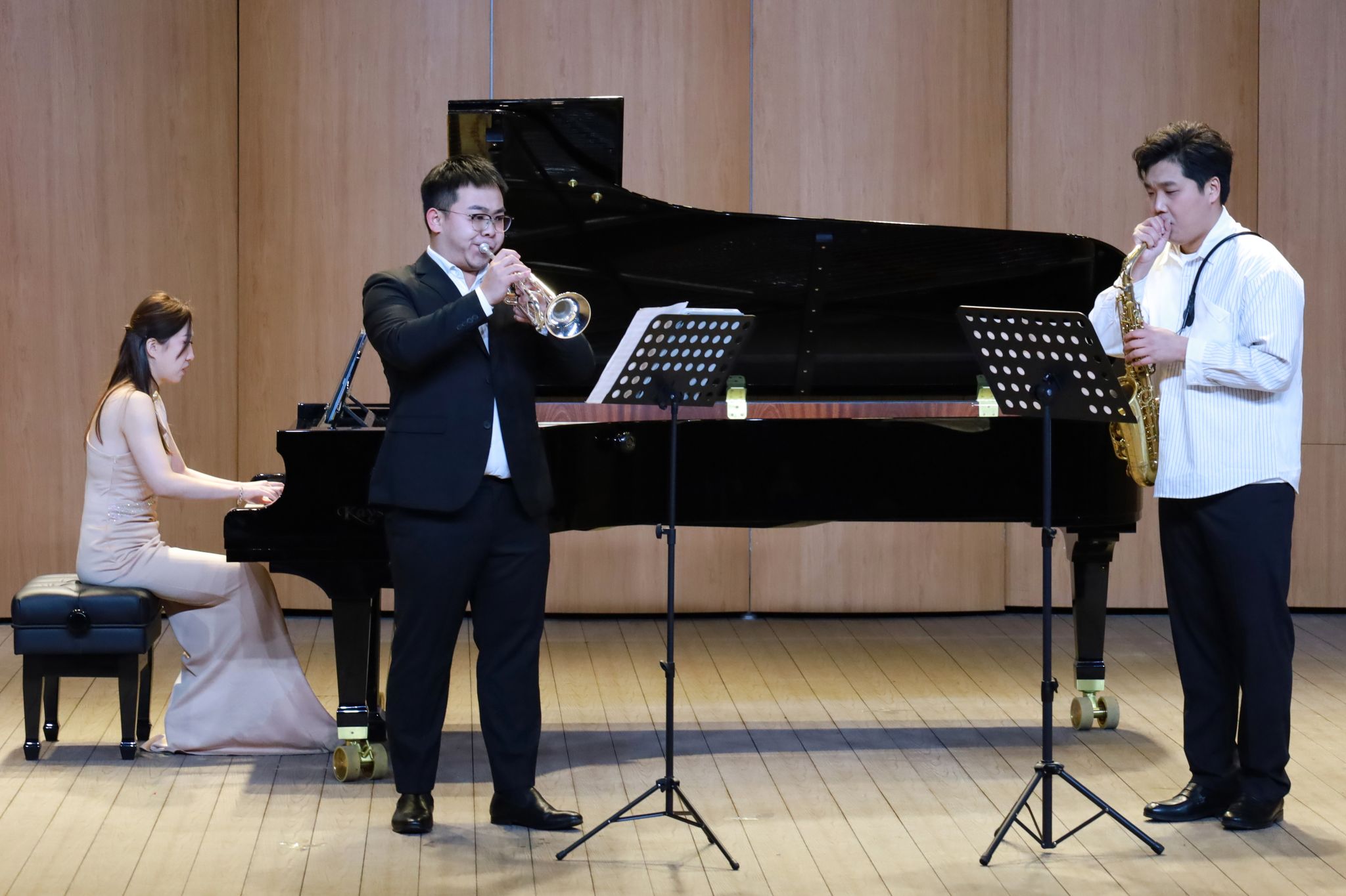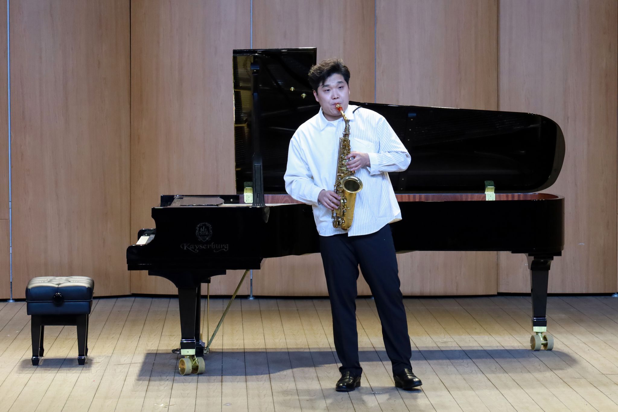 中场休息后,演出热度持续攀升。王晨宇老师接连带来两首风格迥异的钢琴作品:李斯特《威廉・退尔礼拜堂》选自《旅行岁月瑞士集》,琴声如瑞士湖畔的清风,空灵澄澈;而选自钢琴组曲《红色娘子军》的《常青就义》,则在杜鸣心的作曲框架下,以激昂悲壮的旋律再现革命先烈的英雄气概,引发观众强烈的情感共鸣。王辰光老师演唱的《如愿》,钱雷的作曲搭配温暖真挚的萨克斯风,将对家国情怀与美好期盼娓娓道来,治愈人心。