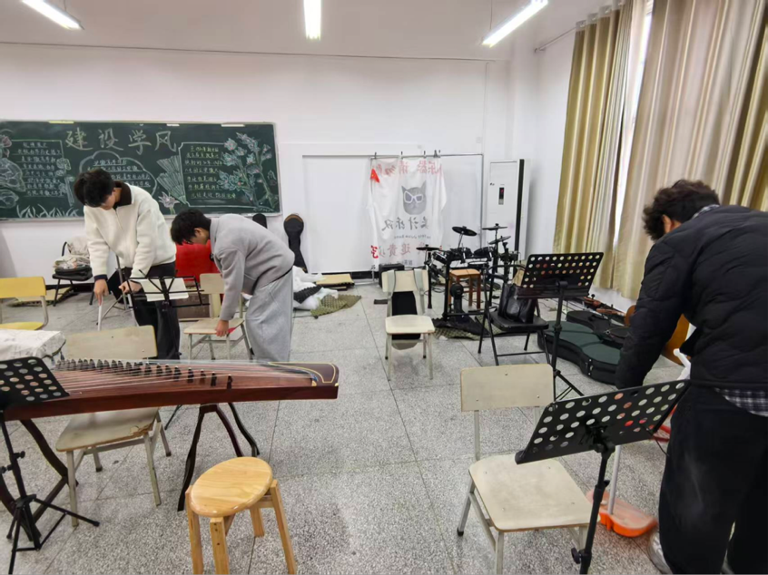 活动中,志愿者们分工协作、干劲十足,以饱满的热情投入到环境整治与美化工作中。在校园非机动车停放区,大家齐心协力,将杂乱停放的车辆逐一归位、整齐摆放,不仅改善了校园交通秩序,也消除了潜在安全隐患,提升了整体通行效率。在专业排练教室,志愿者们细心擦拭古筝、打击乐等乐器设备,规整课桌椅与乐谱架,清理卫生死角,使教学空间焕然一新,为师生营造了更加洁净、规范、舒适的艺术学习和创作环境。